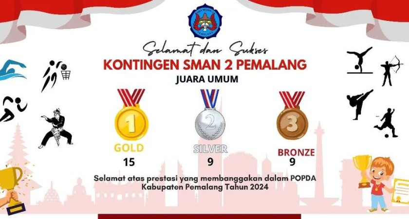 Prestasi gemilang kembali ditorehkan oleh SMA Negeri 2 Pemalang dalam ajang Pekan Olahraga Pelajar Daerah (POPDA) Kabupaten Pemalang Tahun 2024. Dengan semangat juang yang tinggi, para atlet sekolah ini berhasil membawa pulang total 33 medali, terdiri dari 15 medali emas, 9 medali perak, dan 9 medali perunggu.